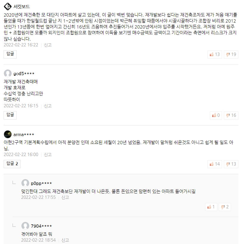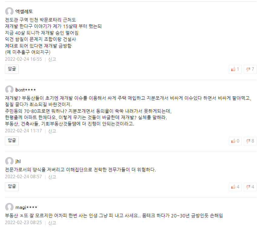 부동산 투자에서 재개발 만큼 큰 부동산 수익은 없습니다. 실제로 부동산 투자의 꽃은 재개발과 재건축이 맞습니다. 하지만 그만큼 위험한 부동산 투자입니다. 아래에는 재개발 투자에 대한 다른 사람들의 생각이 적힌 글들입니다. 한 번 보십시오. 대부분의 생각은 부동산 투자에서 재개발 투자는 아주 오랜 시간이 걸린다는 내용입니다.